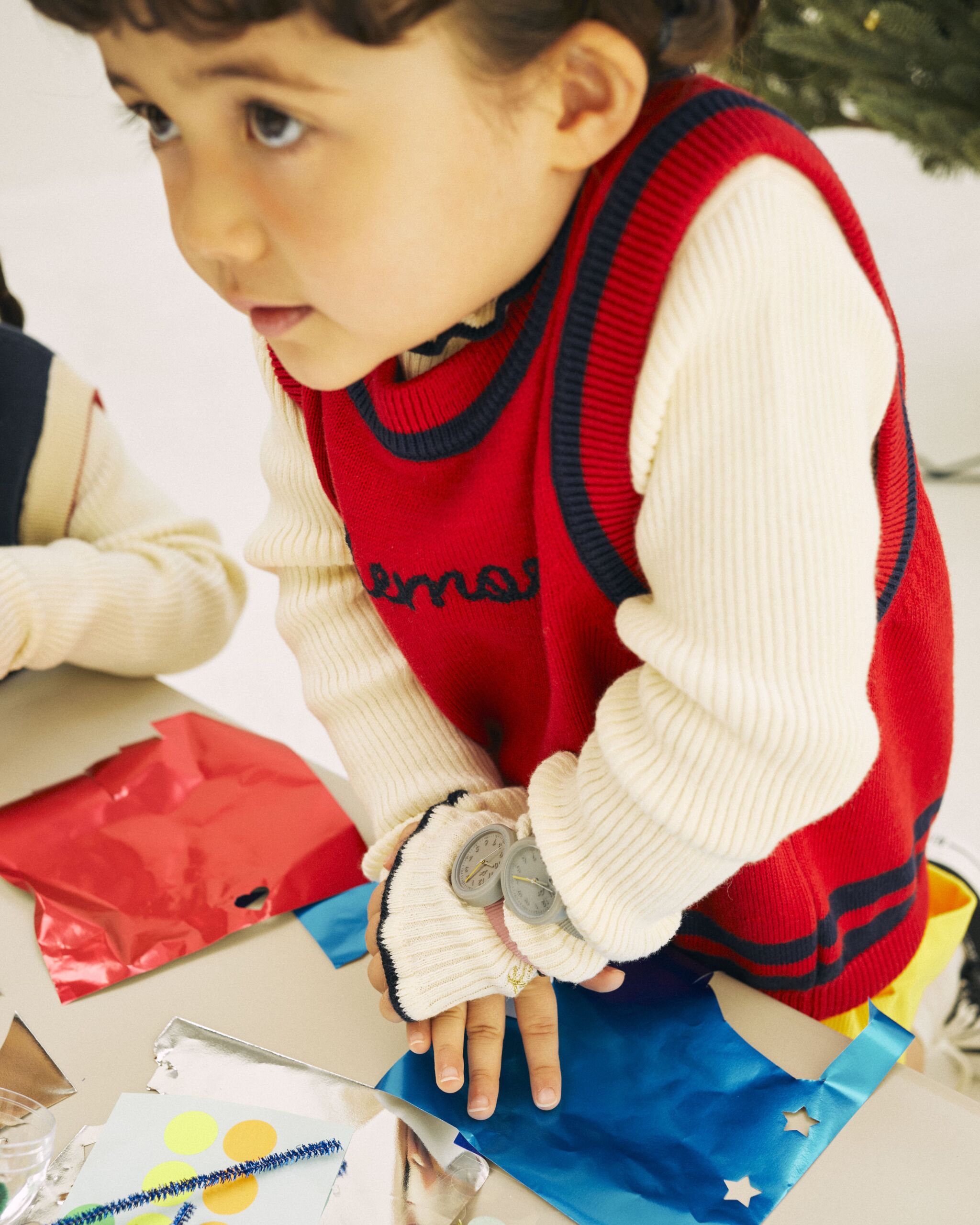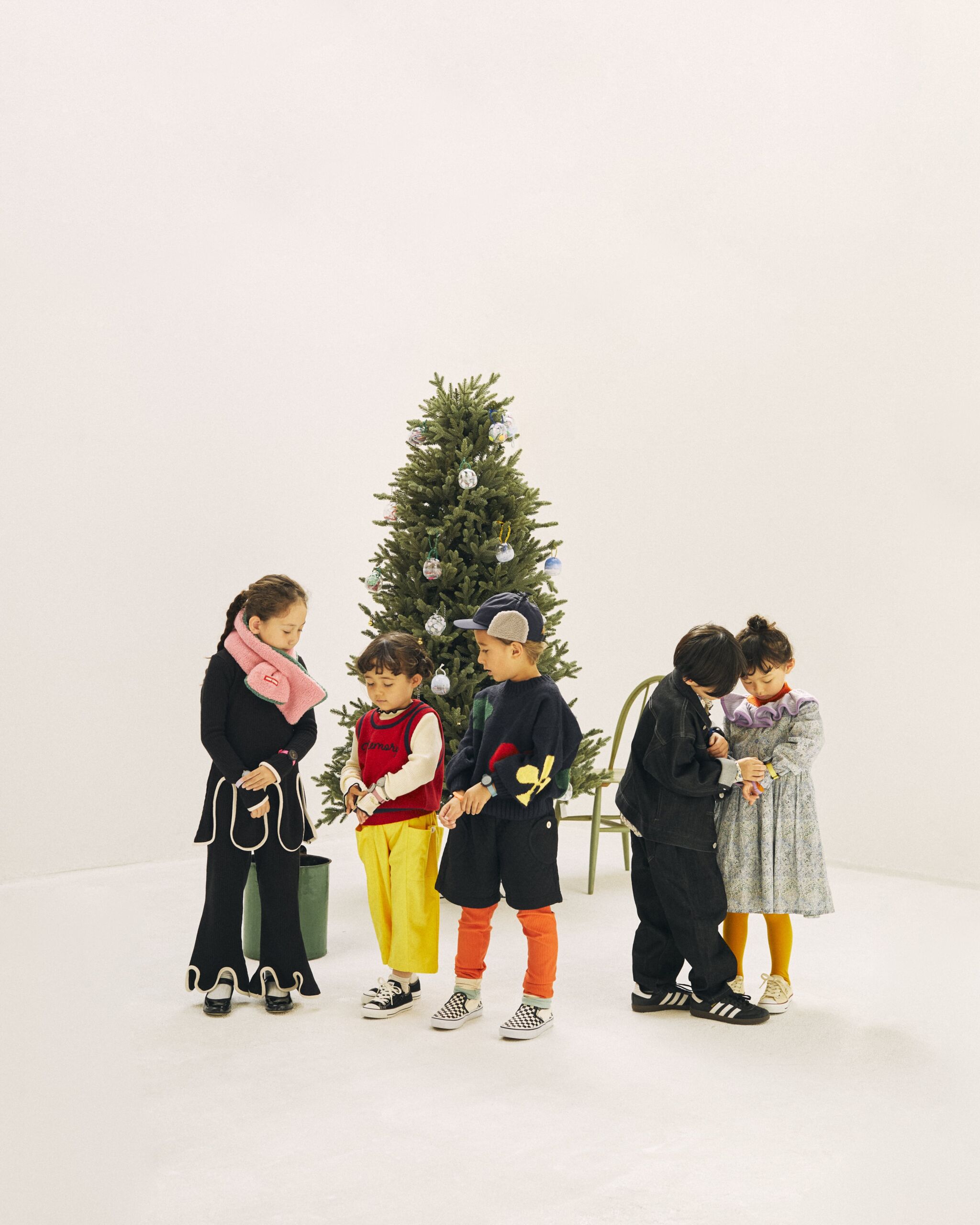 GIRL(イエローパンツ) : リブセーター¥5,940〜/SHIPS(シップス インフォメーションセンター)、ベスト¥16,500/BOBO CHOSES(BOBO CHOSES JAPAN)、パンツ¥7,590/ KoQueliKo(ZoZIO)、スニーカー¥5,940/CONVERSE(コンバースインフォメーションセンター)、ソックス/スタイリスト私物