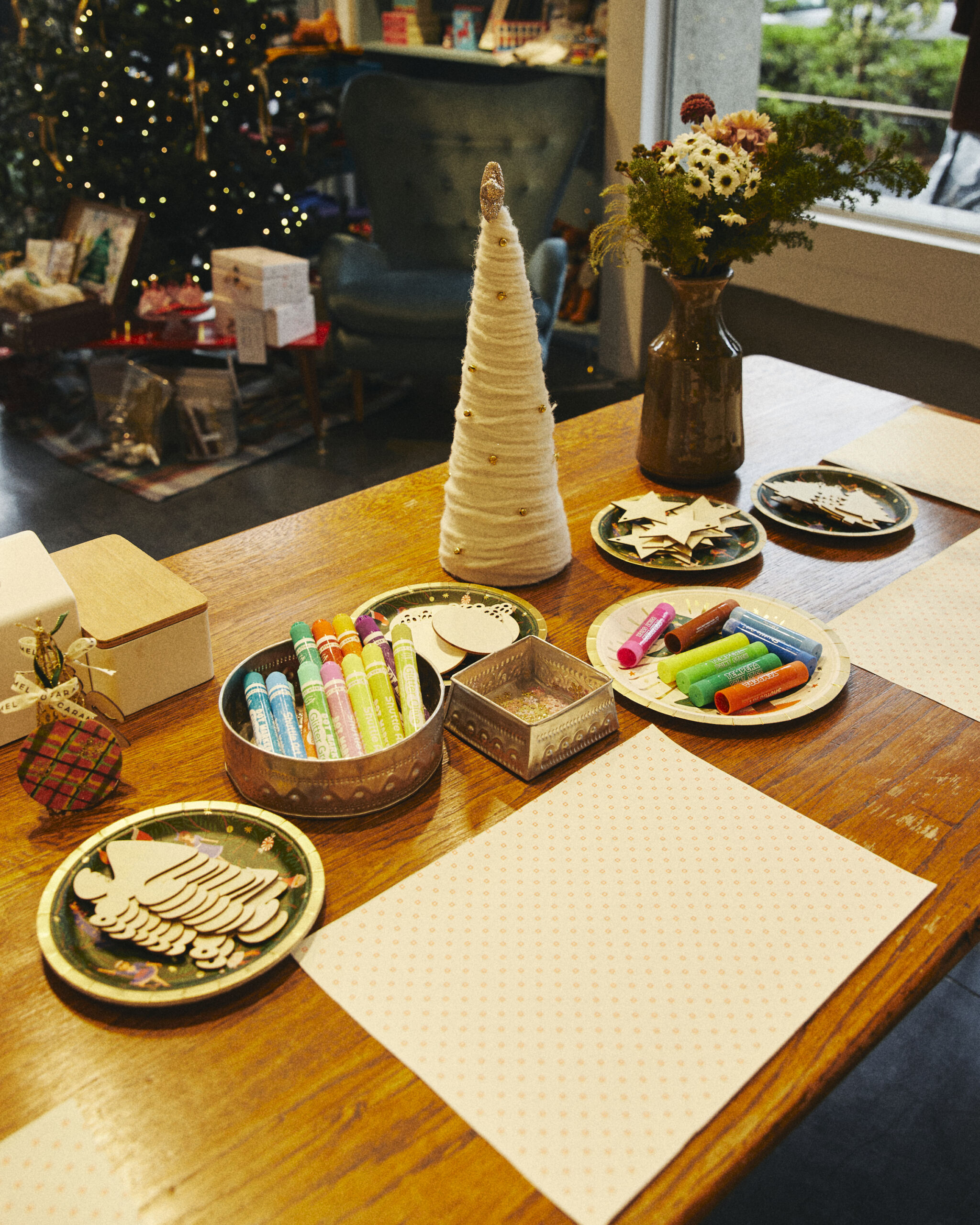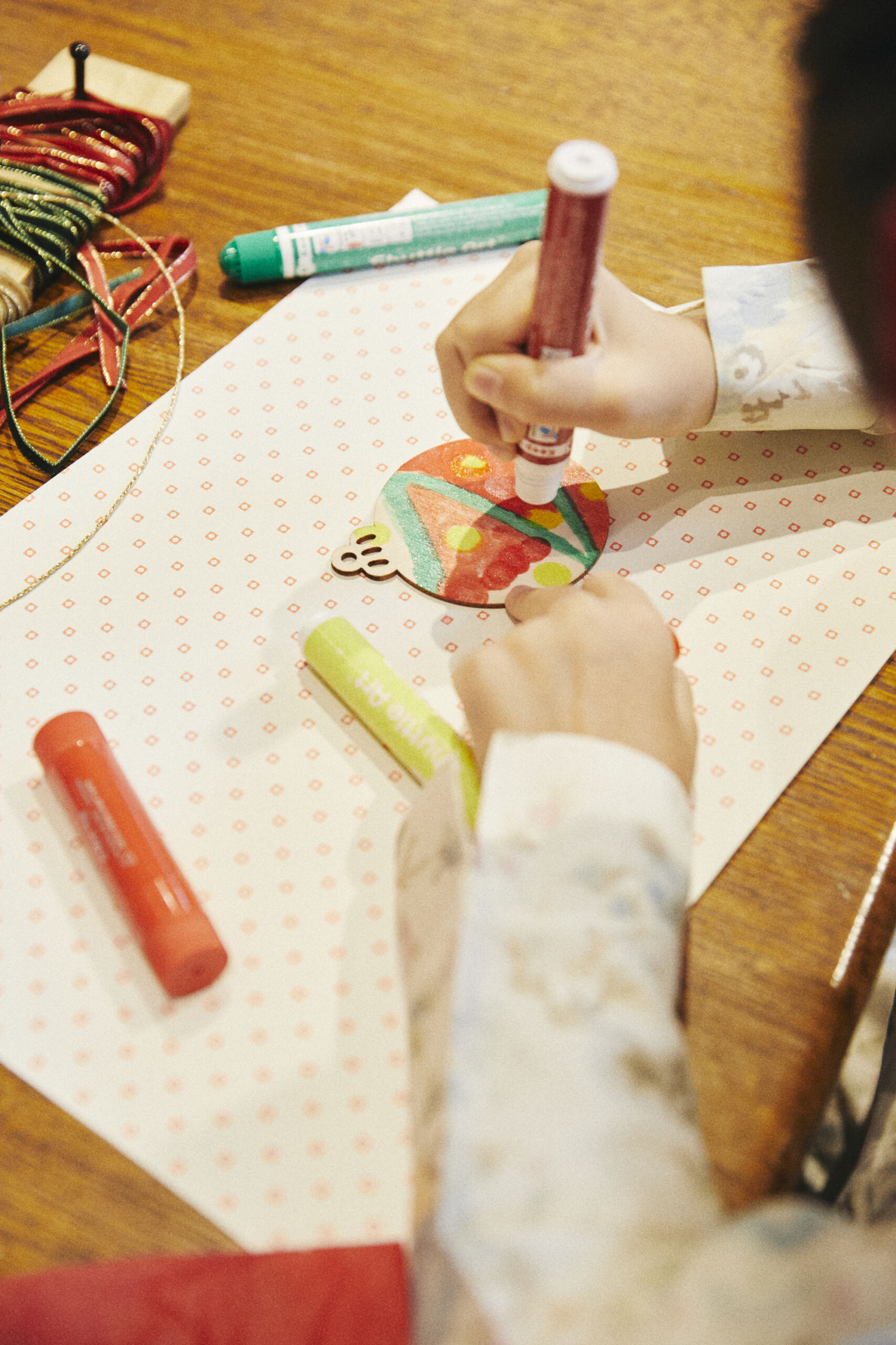 親子で参加できるオーナメント作りでは、色とりどりの素材を使って自由にデコレーション。