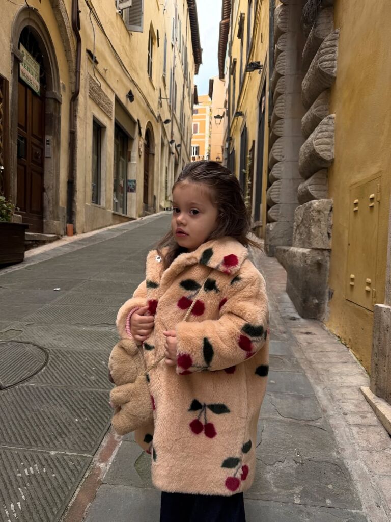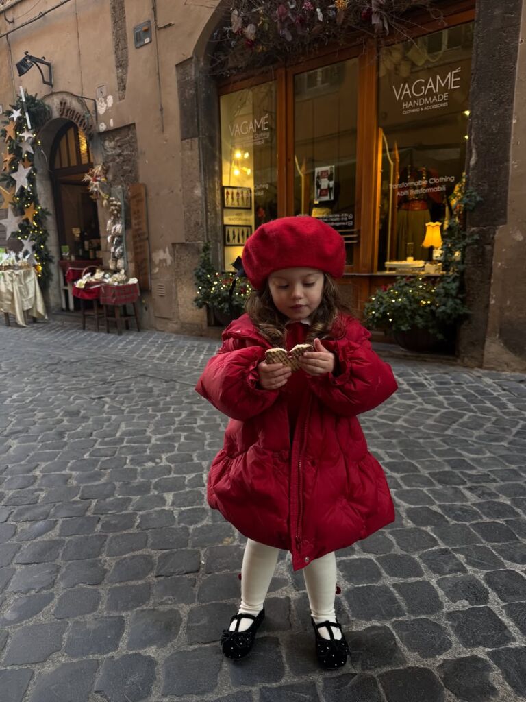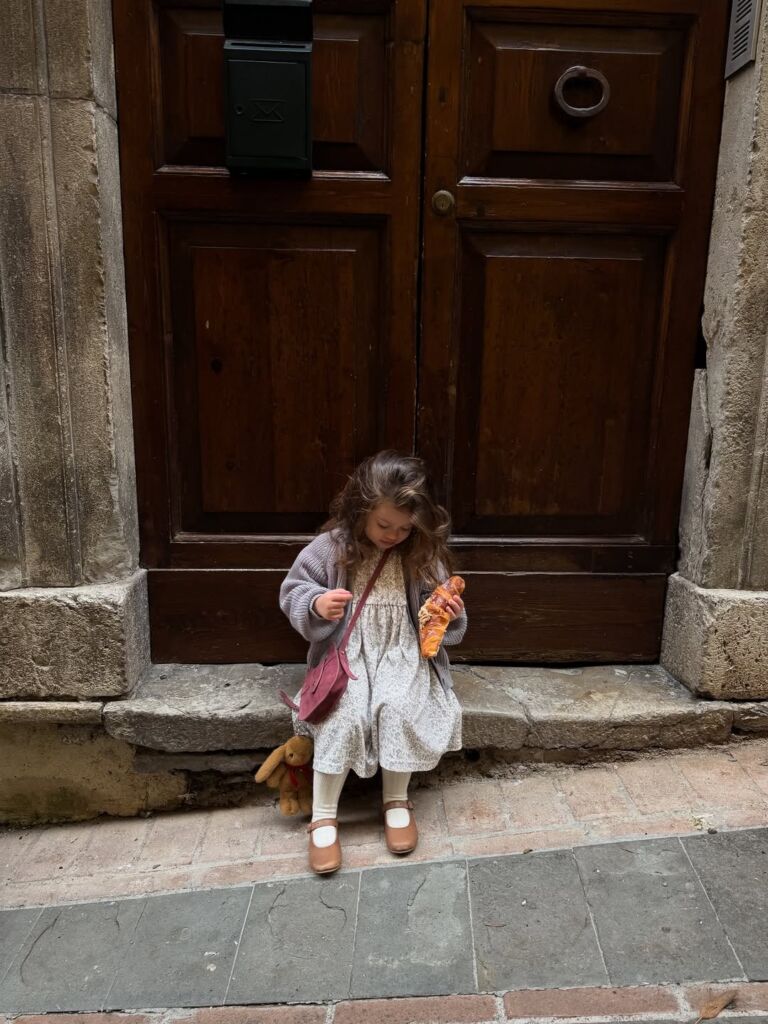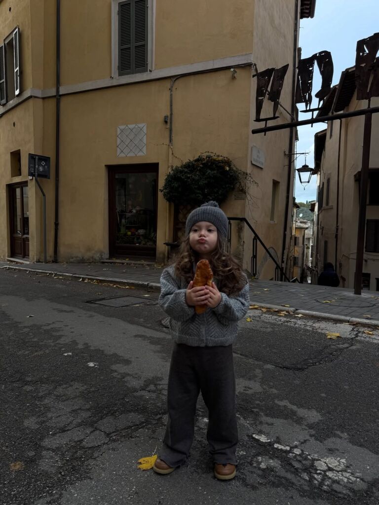 イタリア在住の2歳の女の子。 大好きなクロワッサンを片手に。